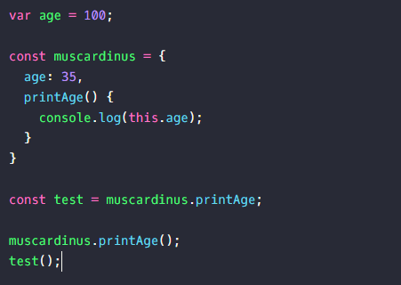 Dot Notation을 이용하여 함수를 실행할 경우, 해당 함수 내부의 this는 Dot 앞에 있는 객체를 가리킨다. 즉 muscardinus를 가리키게 된다. 그리고 muscardinus의 age는 35이다